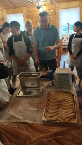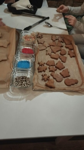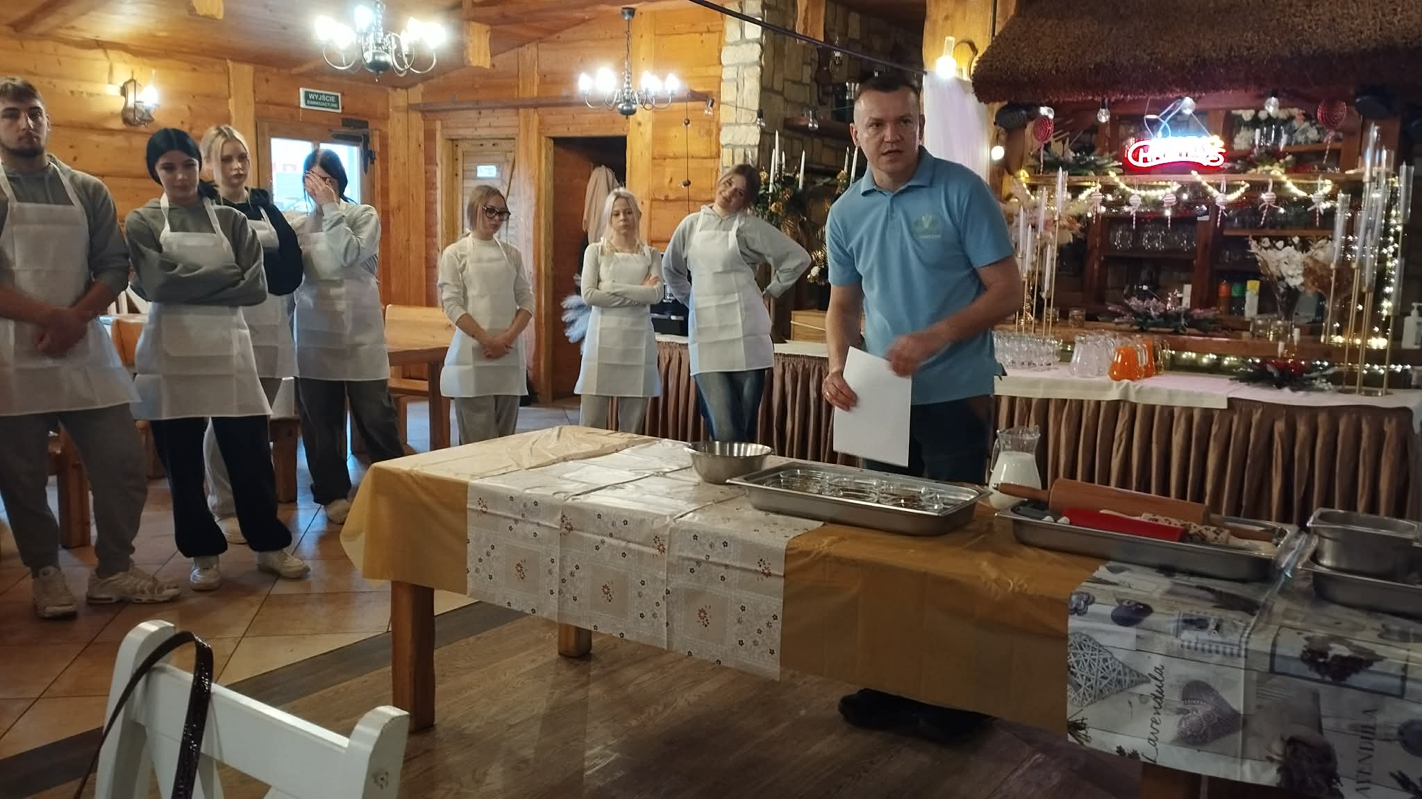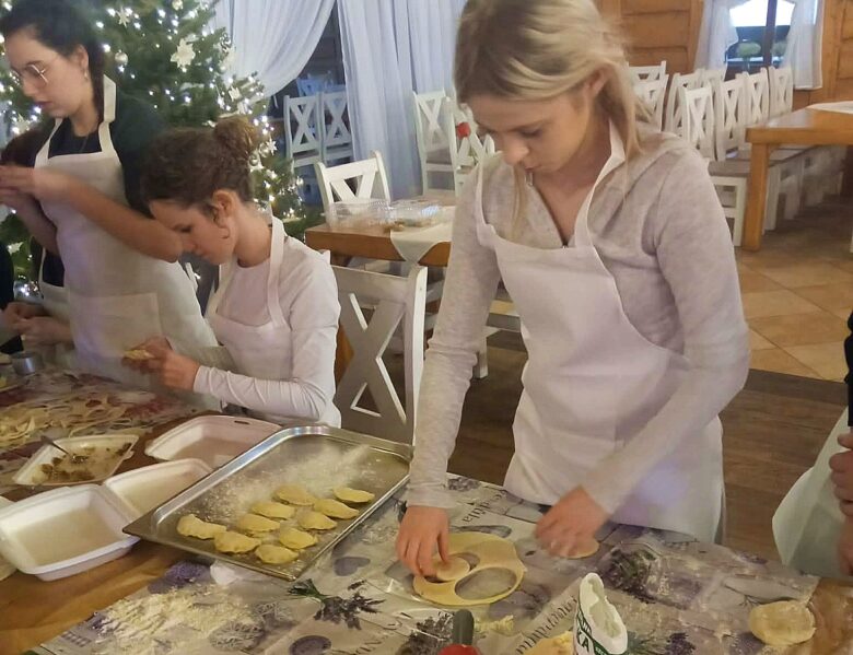 Po krótkim wstępie przyszedł czas na praktykę. Uczestnicy zostali wyposażeni w niezbędne produkty i akcesoria potrzebne do przygotowania tradycyjnych pierogów z kapustą i grzybami oraz aromatycznych pierniczków. Pod czujnym okiem prowadzącego młodzież mogła wcielić się w rolę kucharzy i cukierników, poznając przy tym różnorodne techniki kulinarne. Warsztaty miały w pełni praktyczny charakter – każdy mógł aktywnie uczestniczyć w przygotowaniach, samodzielnie wyrabiając ciasto i formując świąteczne wypieki.