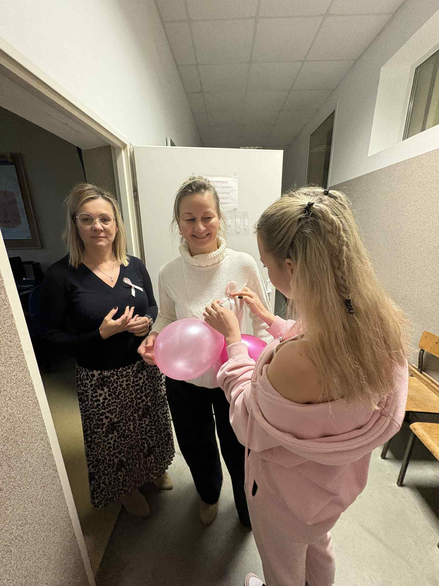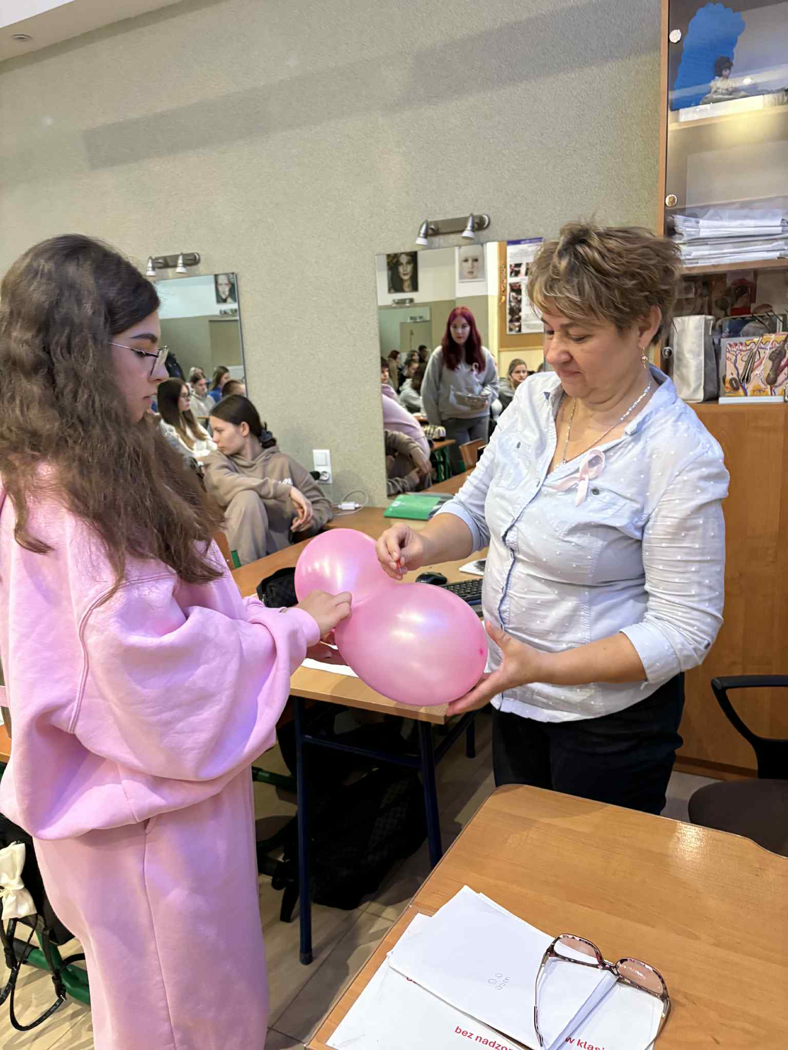Zajęcia zyskały dodatkowy wymiar dzięki współpracy z kursantkami z Centrum Kształcenia Zawodowego, które aktywnie włączyły się w działania edukacyjne. Efektem tej współpracy była profilaktyczna gazetka tematyczna oraz własnoręcznie wykonane różowe wstążeczki – symbol walki i jedności z osobami dotkniętymi rakiem piersi. Uczestniczki z dumą przypięły je swoim koleżankom oraz pracownikom placówki, wyrażając w ten sposób solidarność i wsparcie dla wszystkich kobiet zmagających się z chorobą.