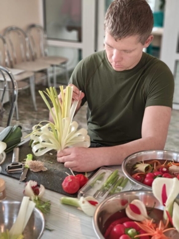 Carving – sztuka wymagająca precyzji, cierpliwości i dużej wyobraźni – przyciągnął uwagę młodych osób z OHP w Gołdapi. Pod okiem instruktorów ze Studio Zmokła Kura uczestnicy poznawali techniki tworzenia efektownych dekoracji, które coraz częściej znajdują zastosowanie w gastronomii, branży eventowej czy usługach dekoratorskich. Podczas zajęć powstawały zarówno misternie wykonane kwiaty z warzyw, jak i spektakularne kompozycje z arbuzów czy melona.