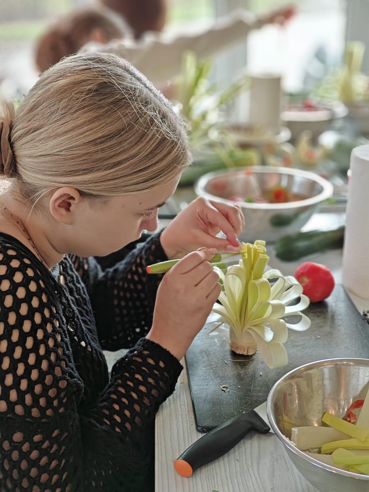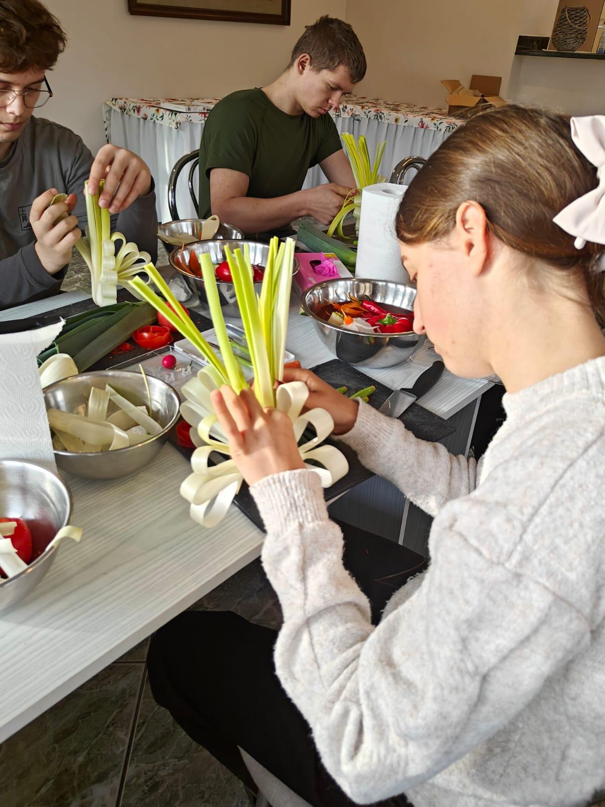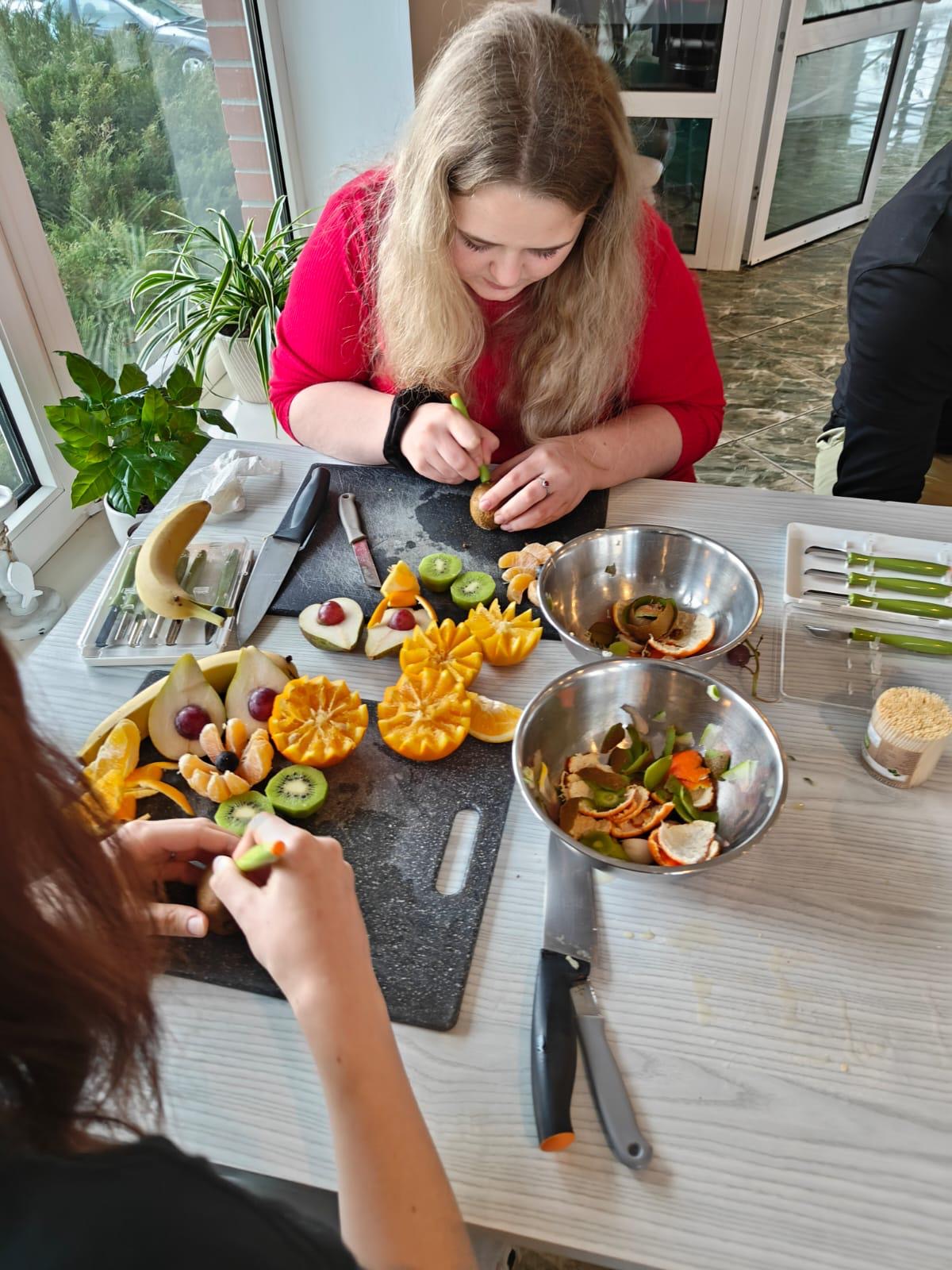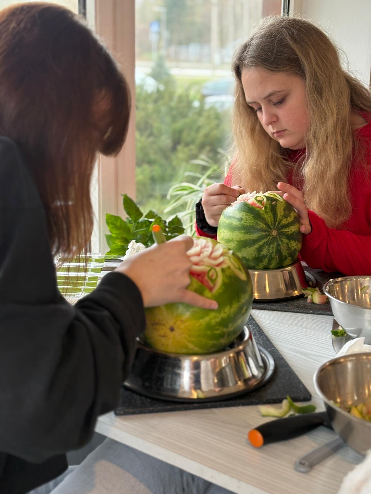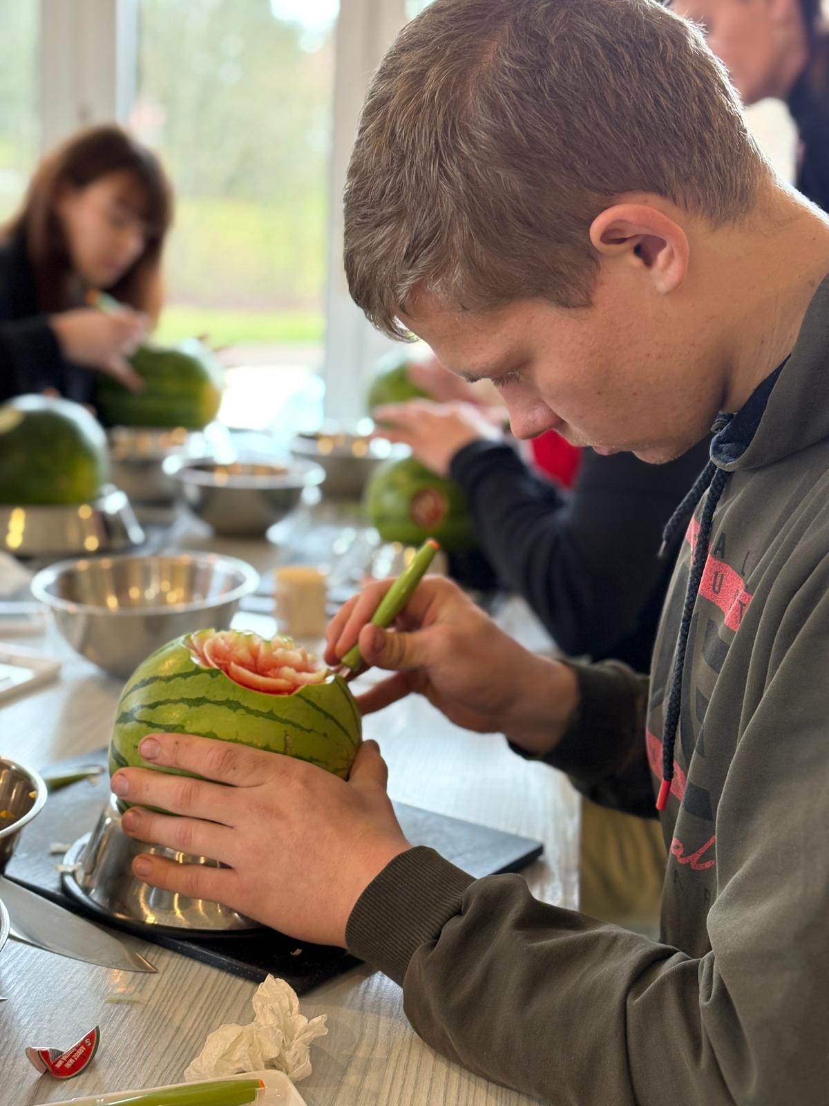 Carving – sztuka wymagająca precyzji, cierpliwości i dużej wyobraźni – przyciągnął uwagę młodych osób z OHP w Gołdapi. Pod okiem instruktorów ze Studio Zmokła Kura uczestnicy poznawali techniki tworzenia efektownych dekoracji, które coraz częściej znajdują zastosowanie w gastronomii, branży eventowej czy usługach dekoratorskich. Podczas zajęć powstawały zarówno misternie wykonane kwiaty z warzyw, jak i spektakularne kompozycje z arbuzów czy melona.