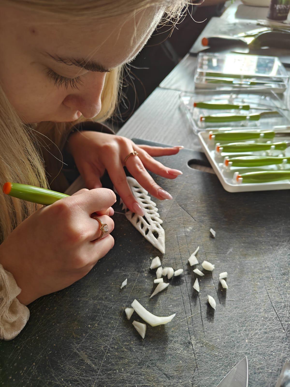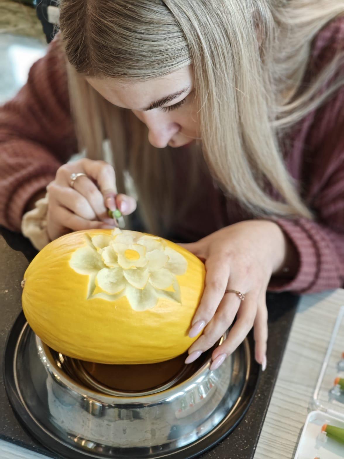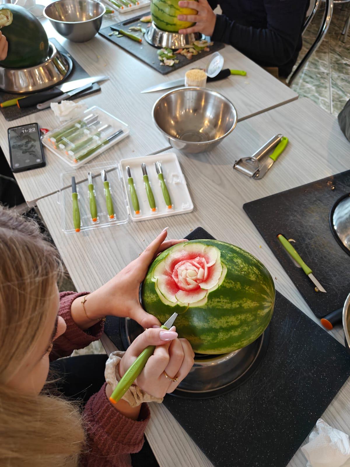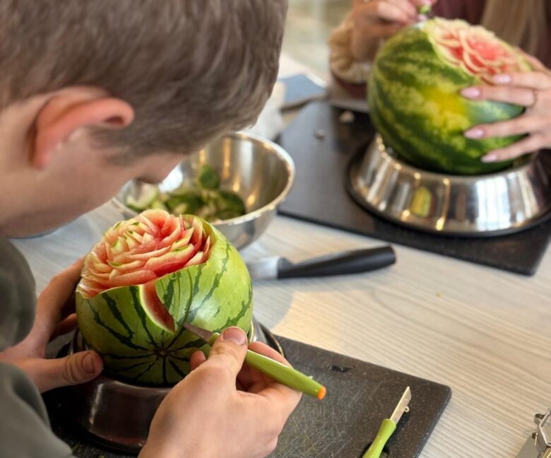 Choć szkolenie skupiało się na podstawach carvingu, ważne było także pokazanie, że kreatywność może stać się pomysłem na biznes. Młodzież zobaczyła, gdzie wykorzystuje się takie dekoracje – od wesel po firmowe eventy – i jak rośnie zapotrzebowanie na osoby, które potrafią je tworzyć.
