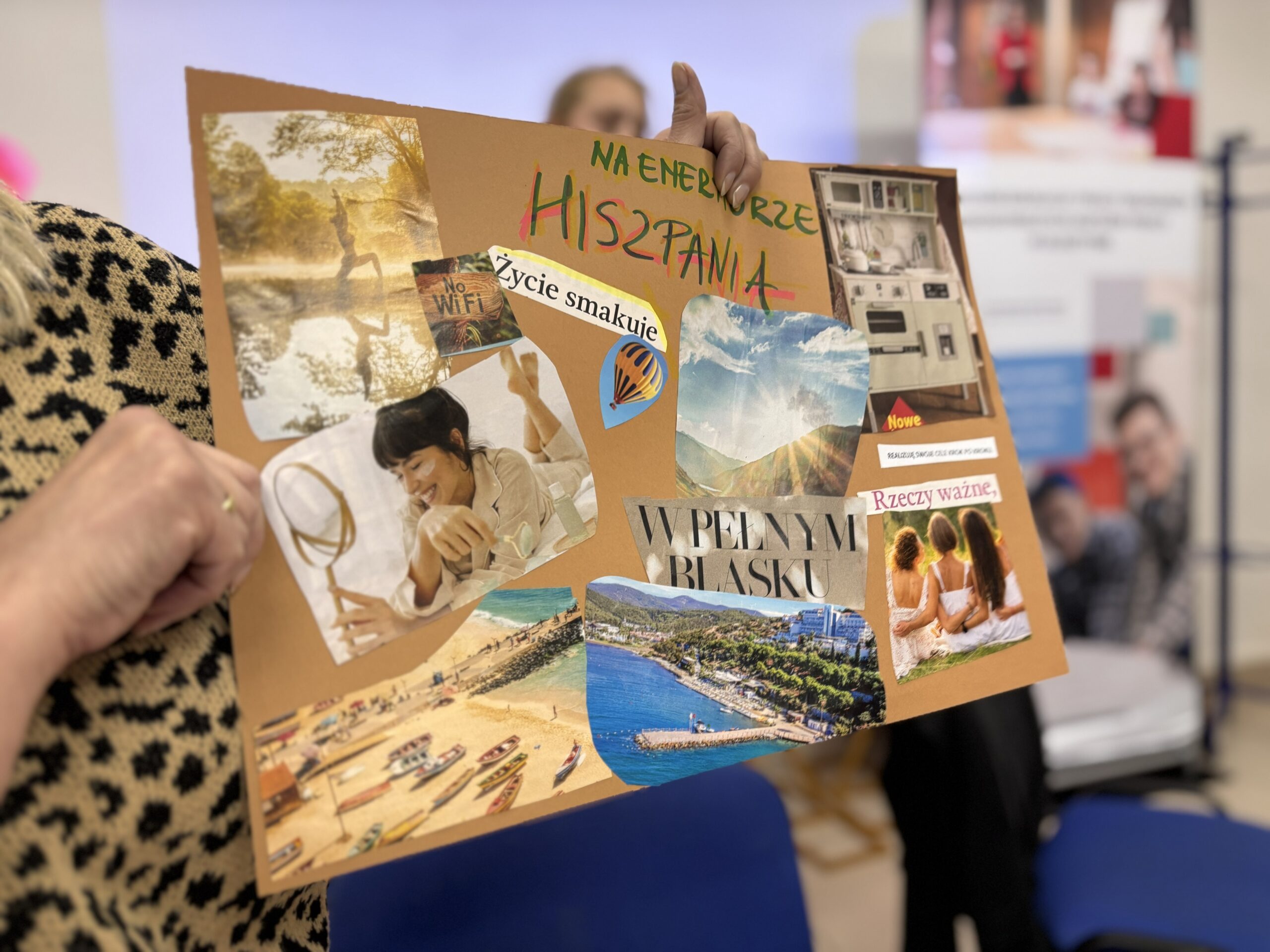 Jednym z kluczowych elementów zajęć było tworzenie mapy marzeń – kreatywnego narzędzia, które pozwala określić priorytety, nazwać cele i zaplanować kolejne kroki prowadzące do ich realizacji. Młodzież, pracując z obrazami, hasłami i własnymi pomysłami, mogła spojrzeć w głąb siebie i zastanowić się, co naprawdę chce osiągnąć w przyszłości.